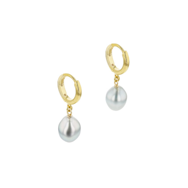 Hinerava’s Nacara Collection features mini high polish huggie earrings set in 14K yellow gold with impeccably matched Tahitian keshis. These earrings are discreet and elegant. Length: 2 cm.