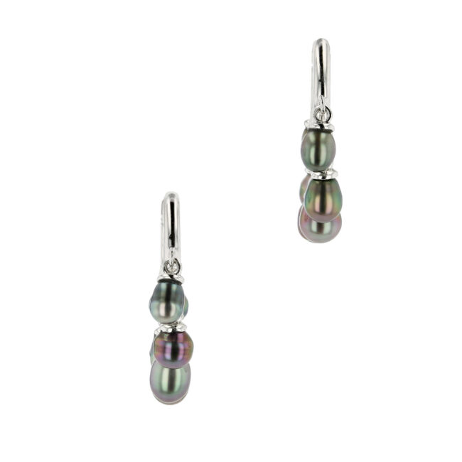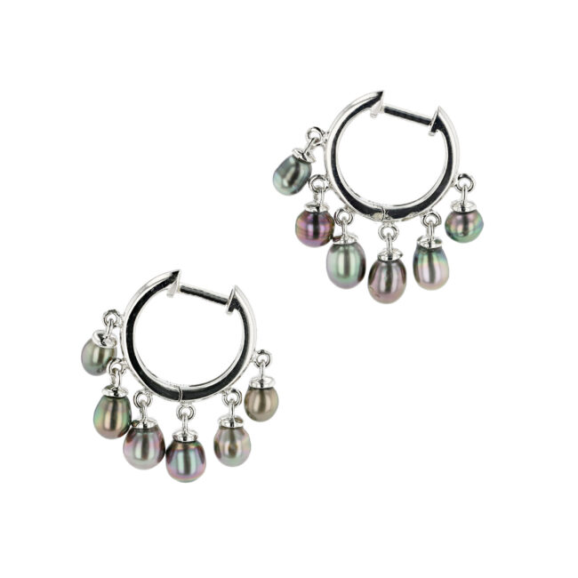 Hinerava’s Nacara Collection features fringe huggie earrings set in 14K white gold with 6 colorful Tahitian keshis layered across the hoop. A modern Hinerava design to complete your favorite bohemian style. Length: 2cm.