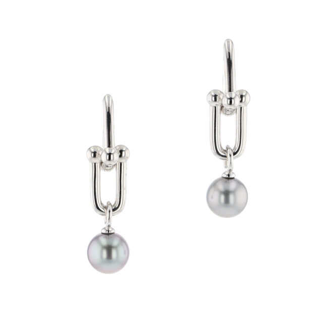 Hinerava’s Elements Collection presents this bold yet elegant pair of earrings, featuring a modern lock chain design, with two dangling 9mm Tahitian pearls, set in sterling silver. A piece that embodies both modern design and timeless elegance. Length: 4cm.