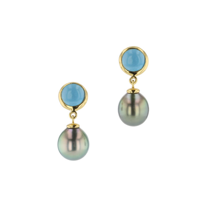 Hinerava’s Elements Collection presents this elegant pair of London blue topaz cabochon earrings, set in vermeil, with splendid 9mm Tahitian pearls. A modern Hinerava design to match with your favorite outfit. Length: 2cm.