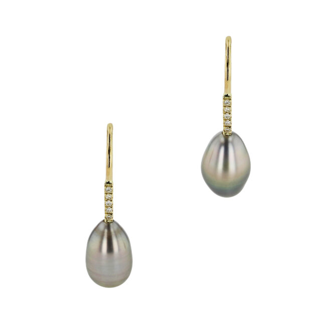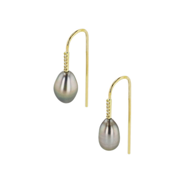 Hinerava’s Nacara Collection features minimalistic white diamond short bar earrings, 0.03 carats, set in 14k yellow gold with exceptional Tahitian keshi pearls. A quintessential Hinerava design for everyday wear. Length: 2 cm.