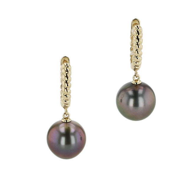 Hinerava’s Signature Collection features these twist huggie earrings set in 14K yellow gold with impeccably matched 9mm Tahitian pearls. This design is a must for every day wear. Length: 2 cm.