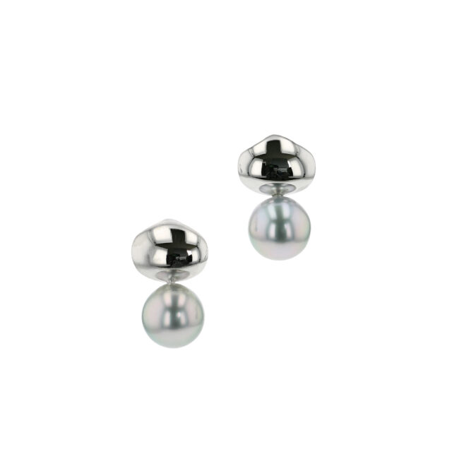 Hinerava’s Elements Collection features this contemporary pair of earrings presenting a whale tail design with two 9 mm Tahitian pearls, set in sterling silver and measuring 2 cm. A modern Hinerava design for everyday wear.