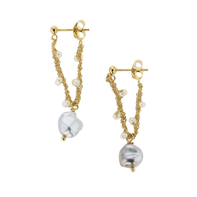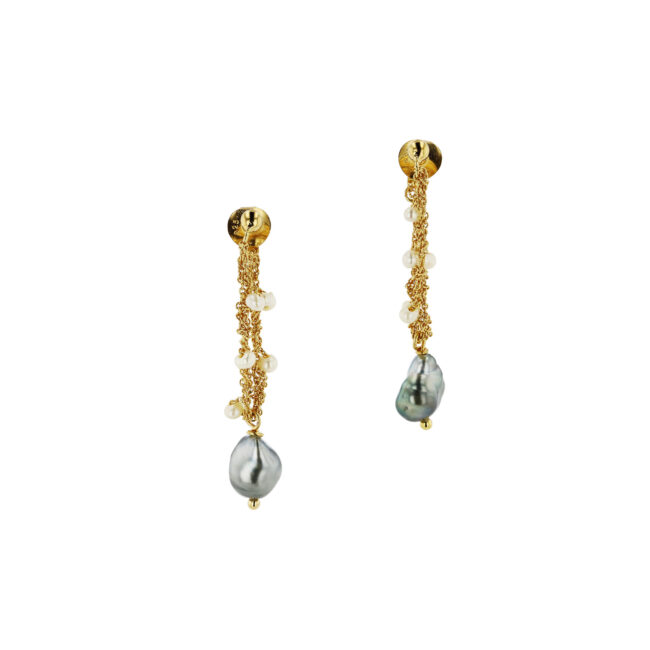 Hinerava’s Nacara Collection features a charming pair of earrings made with white keshis dotted on vermeil braided chains and Tahitian keshi. The chains are linked front to back to the clasp. A flowing creation that is minimalist and ultra feminine. Length : 4cm.