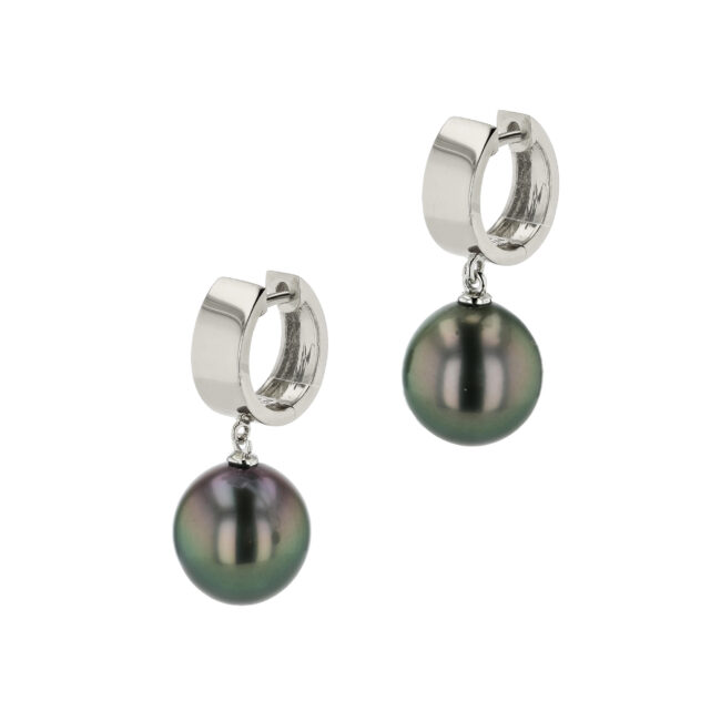 Hinerava’s Signature Collection features these wide huggie earrings set in 14K white gold with impeccably matched 9mm Tahitian pearls. This design is a must for every day wear. Length: 2.5 cm.