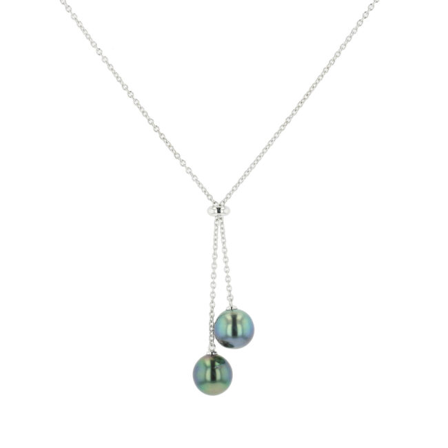 Hinerava’s Elements Collection features this adjustable “Toi & Moi” Tahitian pearl necklace, set in sterling silver. The carefully selected 10mm Tahitian pearls are beautifully contrasting while a center link allows for the length of the necklace to be adjusted. This necklace is available in yellow and white gold. Total length: 54cm.