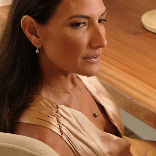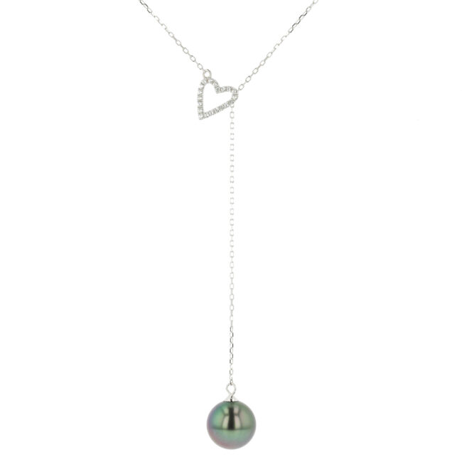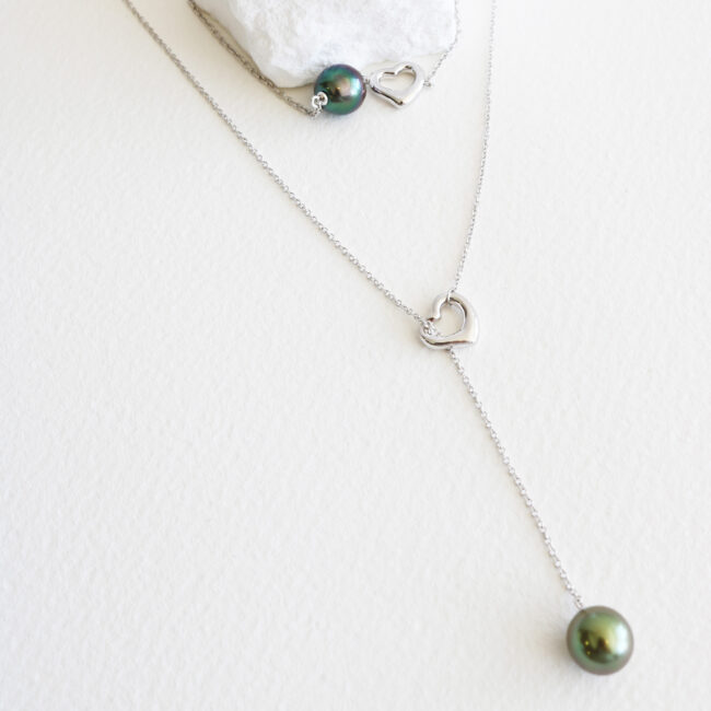 Thus were born the adjustable lariat and the adjustable bracelet designs. The chain slides through the heart for an adjustable length and is elegantly finished with a 9mm, A quality Tahitian pearl, that whispers secrets of love to be carried forever.