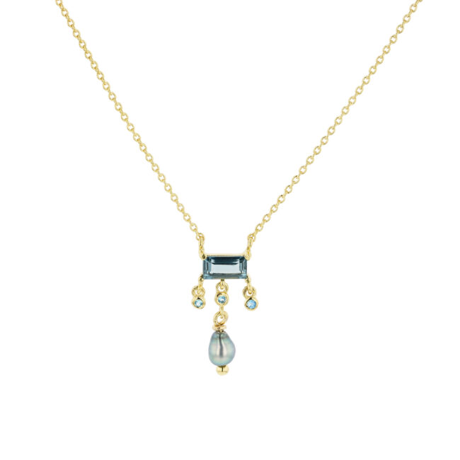 Hinerava’s Nacara Collection presents this gemmy blue topaz necklace, set in vermeil, with a lustruous keshi pearl. A modern Hinerava design to complete your look with elegance and style. Length: 40cm with a 5cm extension chain.