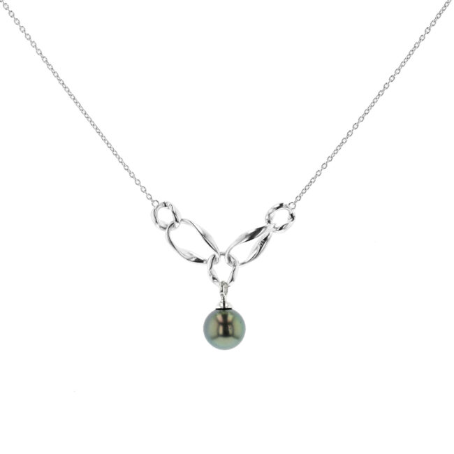 Hinerava’s Elements Collection presents this elegant chain link necklace, set in sterling silver with a 10 mm dangling Tahitian pearl. A contemporary Hinerava design to match with your favorite outfit.