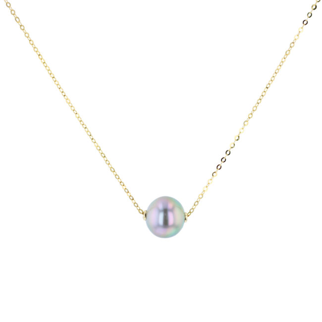 Hinerava’s Signature Collection features a floating Tahitian pearl necklace, set in 18K yellow gold. The pearl is round, measures 10mm and slides freely along the chain. Length : 43cm.