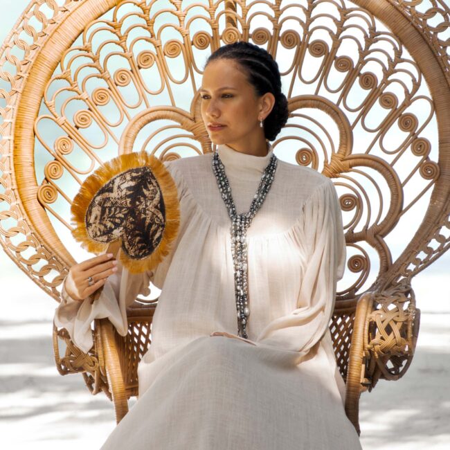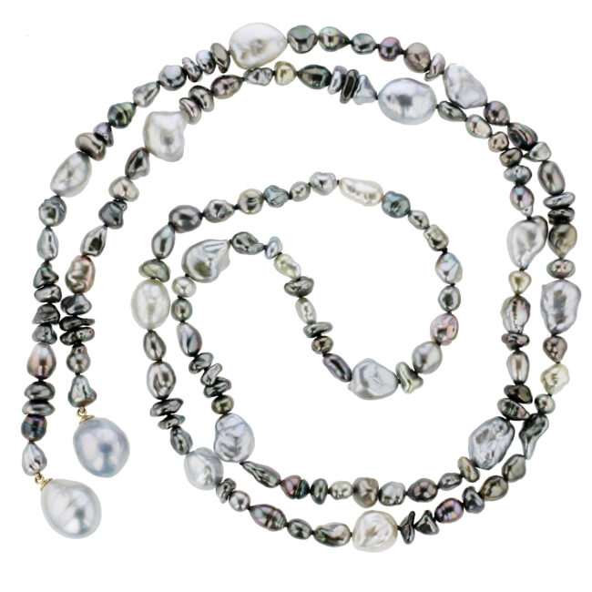 Hinerava’s Harvest Keshi & Pearl Lasso is a unique composition of 141 multicolored keshi & Tahitian pearls, mounted on silk thread and finished with 18K wire. Our harvest strands earn their name for the fascinating variety of shape, size and color of Tahitian pearls and keshi included in each necklace. Length: 120 cm