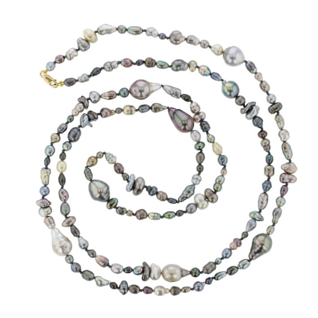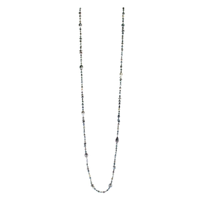 Hinerava’s Harvest Keshi & Pearl Sautoir is a unique composition of 150 multicolored keshi pearls & 8 Tahitian pearls, mounted on a silk and finished with a 18K yellow gold clasp. Our harvest strands earn their name for the fascinating variety of shape, size and color of Tahitian pearls included in each necklace. Length: 100 cm