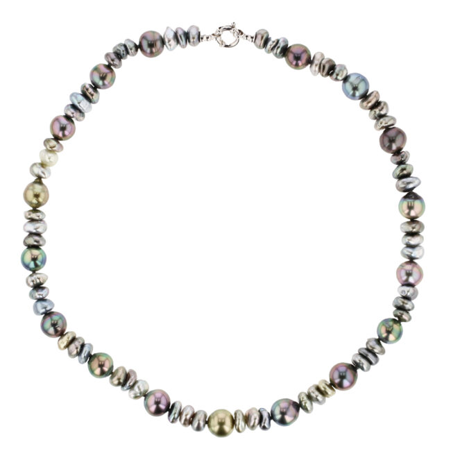 This Hinerava keshi & pearl strand is composed of 17 semi-round luminous Tahitian pearls, valued in B category and measuring 10mm, interwoven with keshi. The pearls are carefully chosen to showcase the myriad colors of Tahitian pearls, while the composition among flat keshi creates a contemporary necklace that is unique in every way. The pearls and keshi are mounted on silk and finished with a sterling silver clasp.