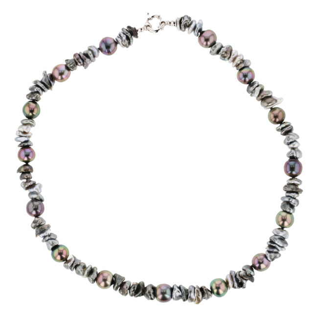 This Hinerava keshi & pearl strand is composed of 15 semi-round luminous Tahitian pearls, valued in B category and measuring 9mm, interwoven with keshi. The pearls are carefully chosen to showcase the myriad colors of Tahitian pearls, while the composition among thin and flat keshi creates a contemporary necklace that is unique in every way. The pearls and keshi are mounted on silk and finished with a sterling silver clasp.