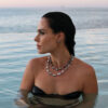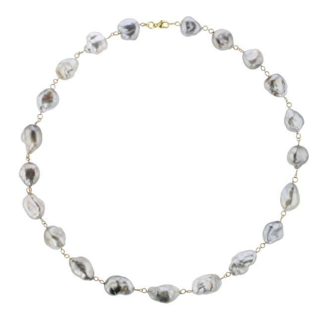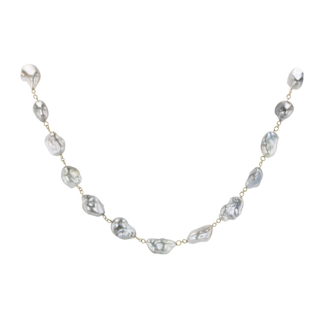 Hinerava’s Nacara Collection presents this unique composition that features 21 irregular, large keshi pearls mounted on a 18K yellow gold hand-wire necklace. A flowing creation that is completely natural and looks great as part of layered necklaces. Length : 50 cm.