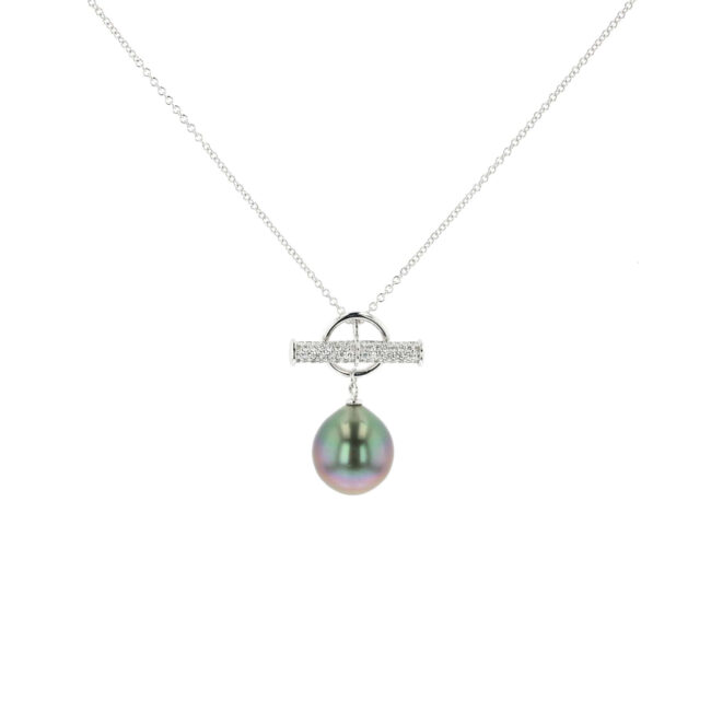 Hinerava’s Coquina Collection presents this contemporary 14K white gold diamond toggle necklace that is customizable with our selection of lovely charms. A diamond bar of 0.23 carats brightens the design while a 10mm Tahitian pearl finishes it with grace. Length: 50 cm with a 10 cm extension chain.