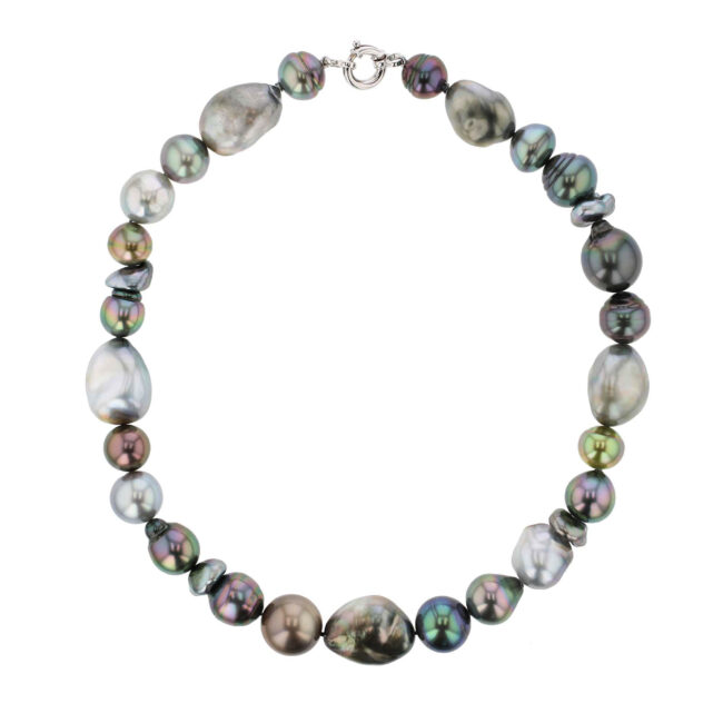 Hinerava Multicolor Extra Large Harvest Pearl Strand is a unique composition that features 29 Tahitian pearls measuring 10 to 17mm, mounted on a silk and finished with a 18K white gold clasp. Our harvest strands earn their name for the fascinating variety of shape, size and color of Tahitian pearls included in each necklace. Length: 43 cm