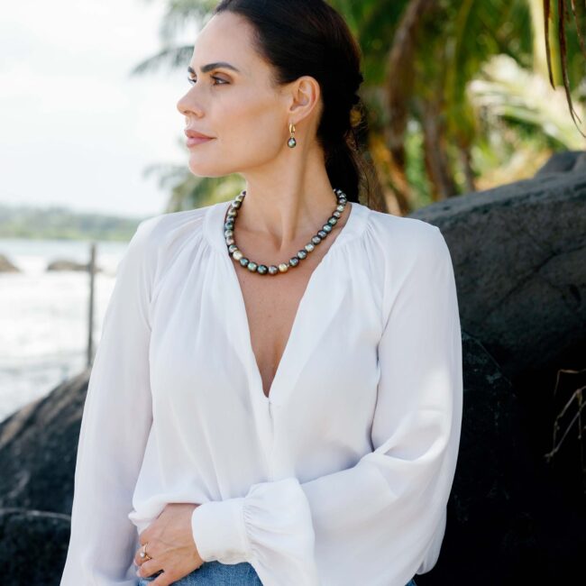 Hinerava's Signature Collection features the harvest strand, a striking display of the various specimens of Tahitian pearls, including round, circled, baroque, and every shape in between. In addition, our harvest strand showcases the vibrant rainbow of colors in which Tahitian pearls occur. Pearls range from 9 to 14 mm size pearls. The sautoir measures 94 cm and is finished with an 18K gold clasp. Each harvest strand is a truly unique work of art.