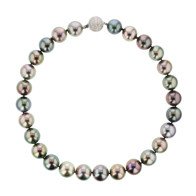 This Hinerava Multicolor Pearl Strand is a unique and exceptional Tahitian pearl necklace featuring 27 exquisite round pearls, valued as gem quality and each measuring 15mm in size. Each pearl is carefully selected to match perfectly within the repetitive composition of blue, aubergine and pistachio pearls. This necklace is an exquisite work of art and is finished with a diamond gold clasp, 0.95 carats set in 18K white gold. Length: 46 cm.