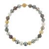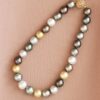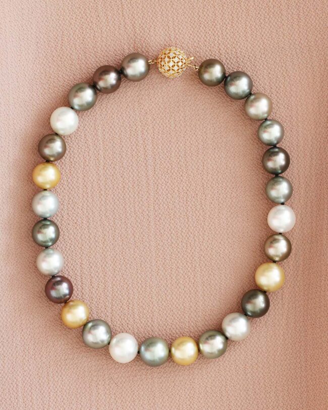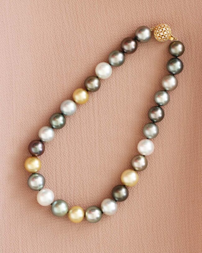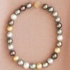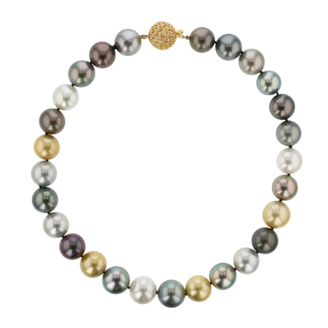 This Hinerava Multicolor Pearl Strand is a unique and exceptional Tahitian pearl necklace featuring 27 exquisite round pearls, valued as gem quality and measuring 14 to 16mm. Each pearl is carefully selected to match perfectly within the repetitive composition of dark, silver and champagne pearls. This necklace is an exquisite work of art and is finished with a diamond gold clasp, 0.24 carats set in 18K yellow gold. Length : 44 cm.