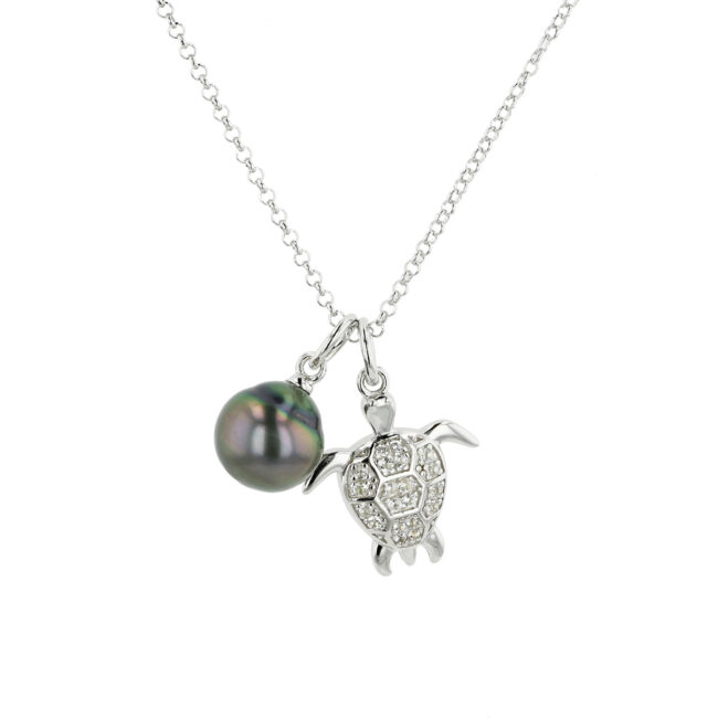 The Turtle Charm & Pearl necklace features a turtle bezeled with white topaz and a beautiful Tahitian pearl, set in sterling silver. The purchase of this necklace contributes to our Giving Back program, where Hinerava dedicates funds to Tetiaroa Society in the preservation of the marine environment. Length: 46 cm.