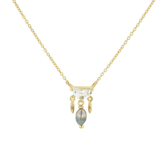 Hinerava’s Nacara Collection features this charming white topaz D-shape necklace, set in vermeil, with a lustruous keshi pearl. This feminine design is petite, understated and yet ever so sophisticated. The perfect finishing touch for your favorite bohemian style and layered look. Length: 40cm with a 5cm extension chain.