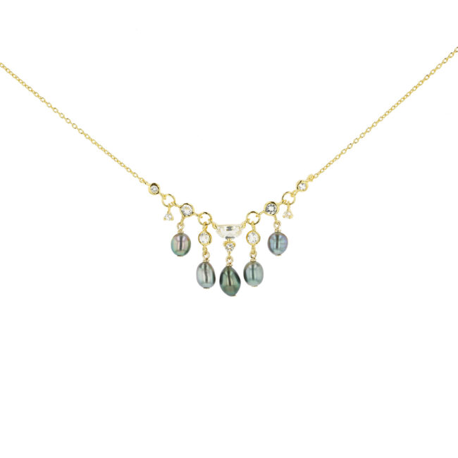 Hinerava’s Nacara Collection presents this elegant necklace, set in vermeil, with 5 lustruous keshi pearls. This contemporary design is the perfect finishing touch to your favorite style and is great as part of a layered look. Length: 40cm with a 5cm extension chain.