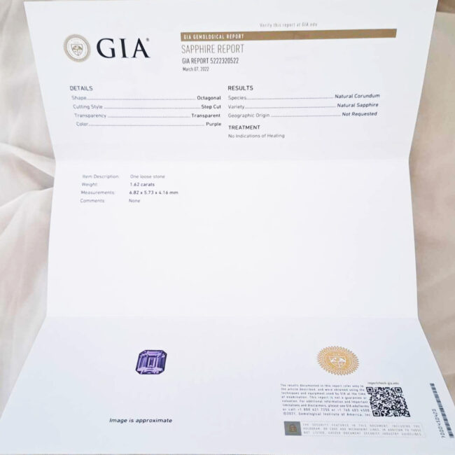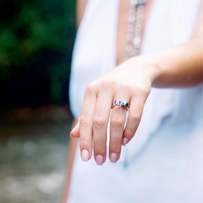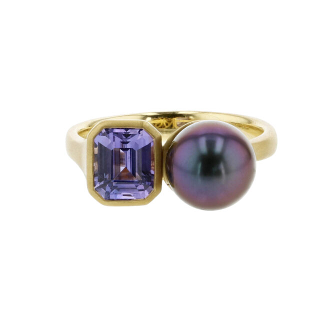 This Hinerava ring is a unique design incorporating an aubergine 8mm Tahitian pearl matched to a bezel, emerald cut, GIA certified purple sapphire weighing 1.62 carats, set in 18K yellow gold with satin finish. A one-of-a-kind creation from Hinerava’s Privilège Collection of dramatically vibrant and luxurious jewels.