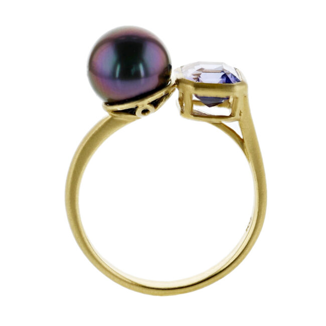 This exceptional ring from Hinerava's Privilège Collection features a lavender 9mm Tahitian pearl, perfectly matched to an asscher cut tanzanite, 2.48 carats, mounted in 18K yellow gold bezel with satin finish. This handcrafted masterpiece elevates your look while instantly providing an irresistible touch of refined glam.