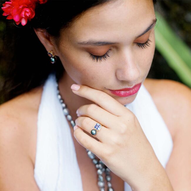 Hinerava’s Privilège Collection features an exquisite pair of earrings made with cushion cut tanzanite gemstones, 3.52 carats, matched with exceptional 9mm, lavender Tahitian pearls, set in 18K white gold. A one-of-a-kind creation from Hinerava’s Privilège Collection of dramatically vibrant and luxurious jewels.
