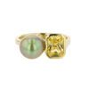 This spectacular ring is a unique design incorporating an exceptionally rare, champagne shaded, 8mm Tahitian pearl matched to a GIA certified, bezel radiant cut yellow sapphire weighing 2.01 carats, set in 18K yellow gold. The captivated brillance of the gems draws an elegant silhouette to elevate your look.