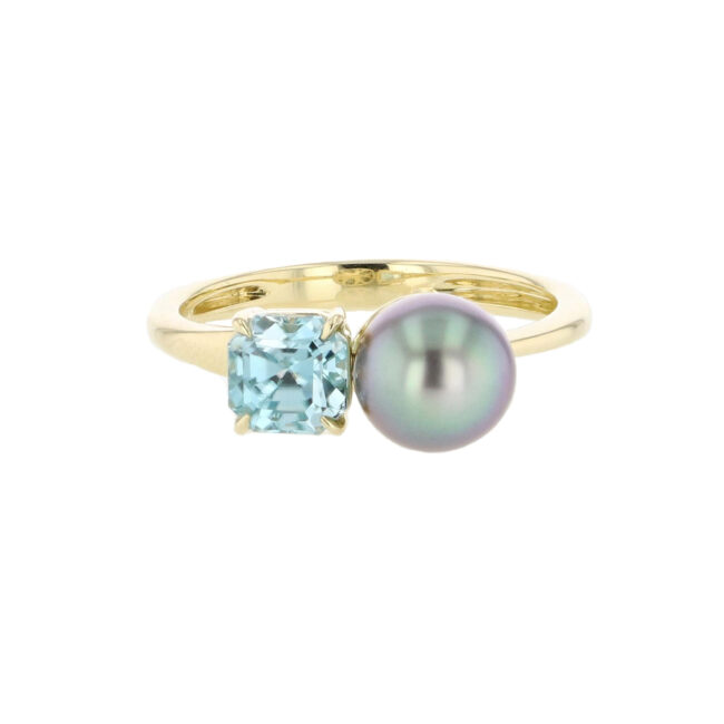 Hinerava’s Poésie Collection presents this unique creation that unites a 1.35ct blue asscher zircon with a striking blue and violet haloed Tahitian keshi pearl. Set in 14K yellow gold, the zircon is paired with a natural keshi pearl, whose organic shape epitomizes perfection within the imperfect.