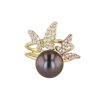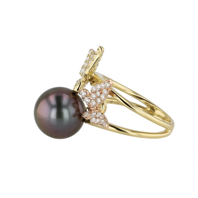 Hinerava’s Signature Collection presents an exquisite duo ring adorned with two diamond paved butterflies, 0.56 carats and an exceptional 11 mm Tahitian pearl, mounted in 18K yellow gold. The smaller butterfly is made of 18K rose gold.