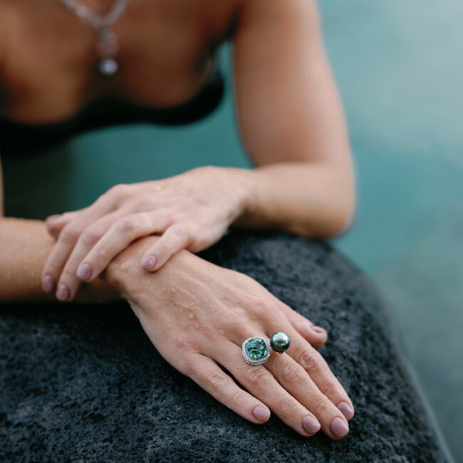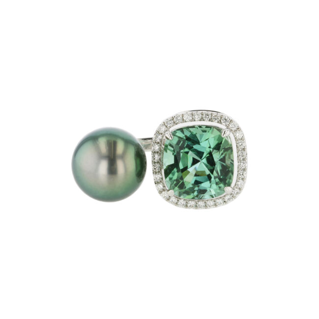 Each piece in Hinerava’s Privilège Collection embodies timeless luxury. This exquisite, one of a kind ring features a cushion cut green tourmaline weighing 10.10 carats, with a lustrous 12.41mm light green Tahitian pearl, set in 5.7 grams of 18K white gold. A regal and dramatic design that radiates elegance.