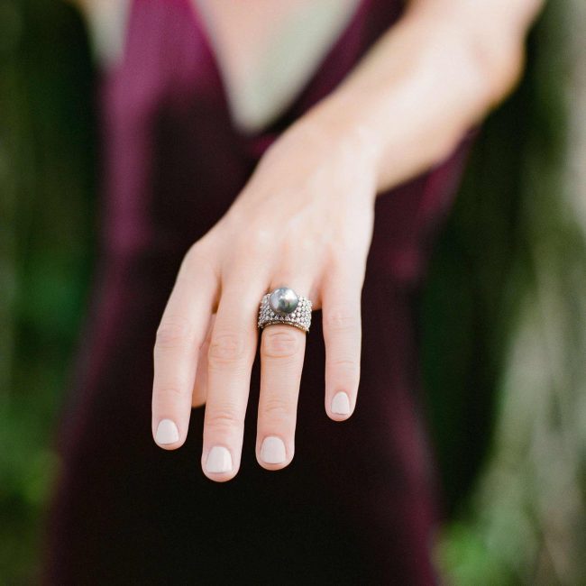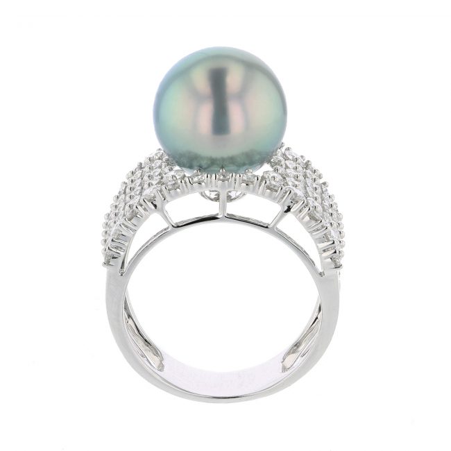 Each piece in Hinerava’s Privilège Collection embodies timeless luxury. This 18K white gold ring features a lustrous 12mm light blue Tahitian pearl amid 1.98 carats of scintillating diamonds arranged in a lace pattern, set in 6.09 grams of gold. A bold and dramatic design that is simultaneously elegant.