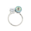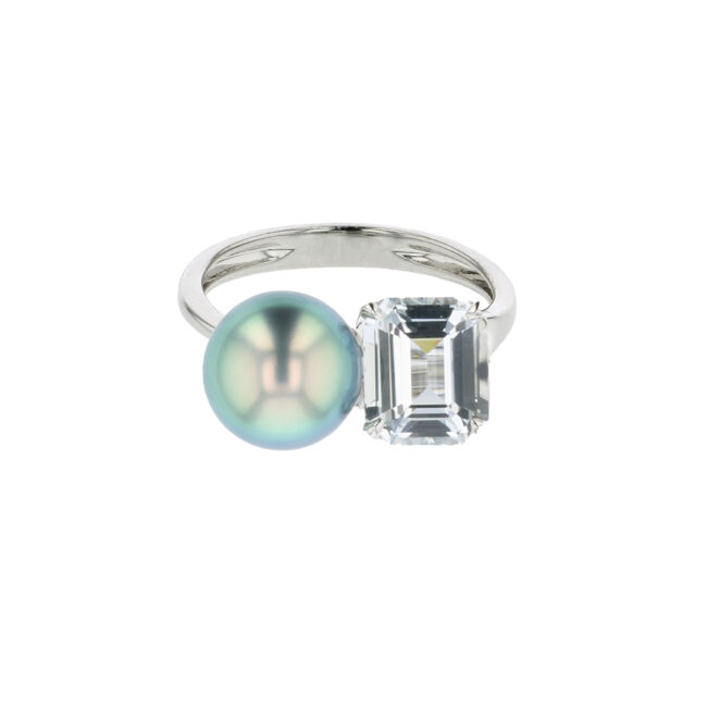 This exquisitely handcrafted ring, mounted on 2.64g of 18K white gold, features an exceptional bright blue, gem quality, 8mm Tahitian pearl, that is artfully married to a white emerald cut sapphire, 3.11ct, creating a timeless union. A one-of-a-kind creation from Hinerava’s Privilège Collection of dramatically vibrant and luxurious jewels.