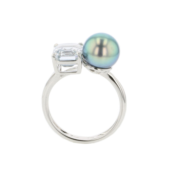 Each piece in Hinerava’s Privilège Collection embodies timeless luxury. This exquisite, one of a kind ring features an elongated cushion cut, lagoon blue tourmaline weighing 8.20 carats, with a lustrous 12.64mm blue green Tahitian pearl, set in 4.8 grams of 18K white gold. A regal and dramatic design that radiates elegance.