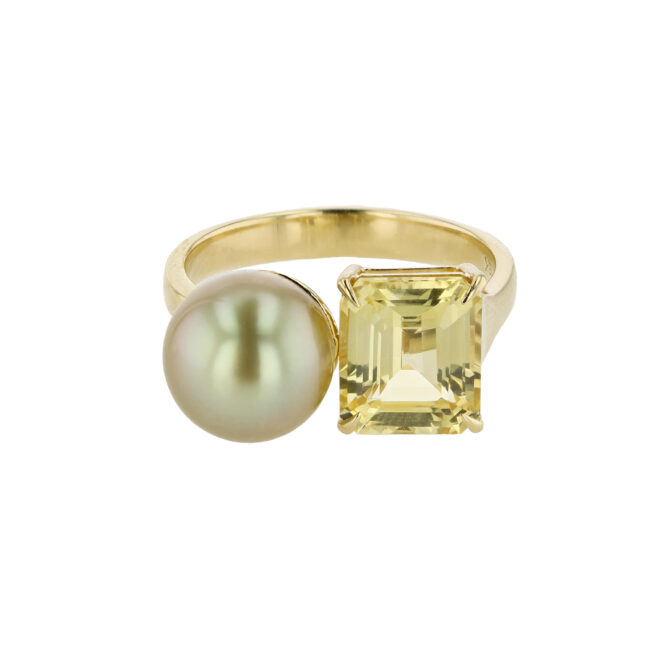 This exquisitely handcrafted ring features a gem quality, golden, 9mm Tahitian pearl that matches perfectly to an exceptional, emerald cut, GIA certified yellow sapphire, 3.51carats, mounted in 18K yellow gold. A one-of-a-kind creation from Hinerava’s Privilège Collection of dramatically vibrant and luxurious jewels.