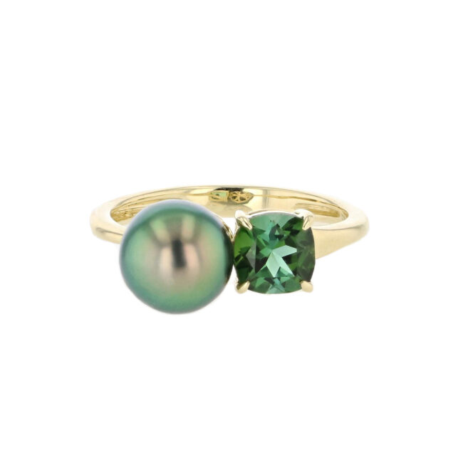 Green Cushion Cut Tourmaline & Pearl Ring