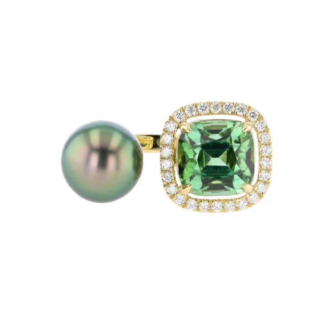 Green Cushion Tourmaline & Diamond Pearl Open Ring