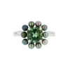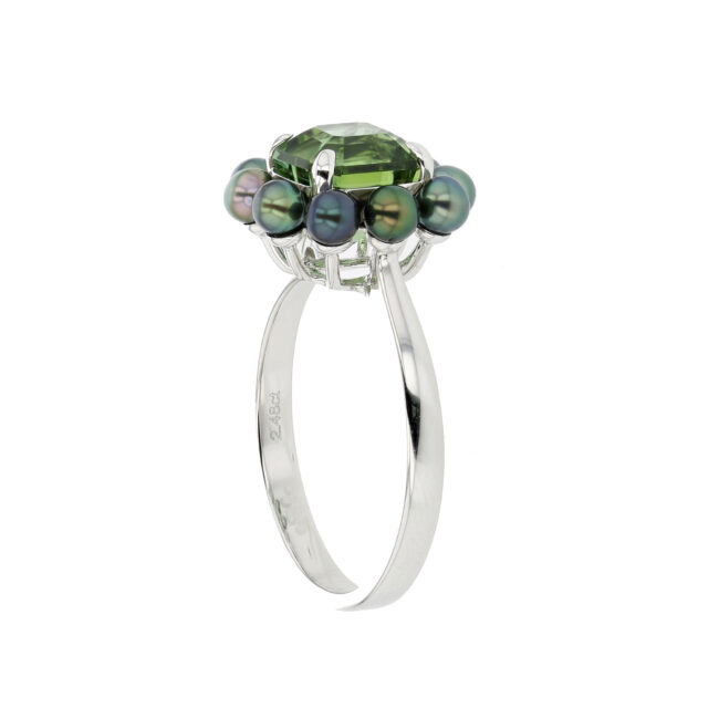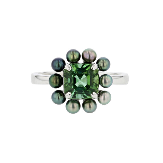 This Hinerava’s Privilège Collection spectacular ring is a unique design incorporating an asscher cut green tourmaline weighing 2.48 carats, haloed with 10 blue green round keshi pearls, set in 18K white gold. A one-of-a-kind creation from Hinerava’s Privilège Collection of dramatically vibrant and luxurious jewels.
