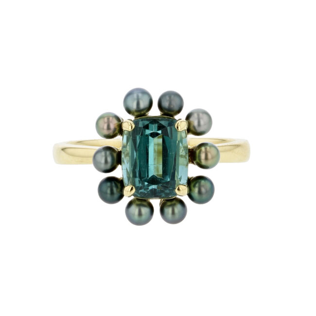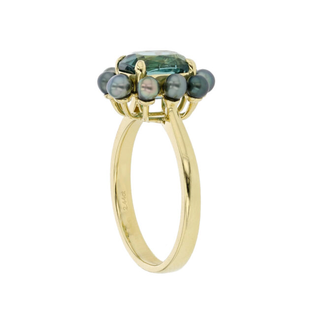 This exceptional ring from Hinerava’s Privilège Collection features a cushion cut blue tourmaline weighing 2.44 carats, haloed with 10 bluish keshi pearls, mounted in 18K yellow gold. A one-of-a-kind creation from Hinerava’s Privilège Collection of dramatically vibrant and luxurious jewels.