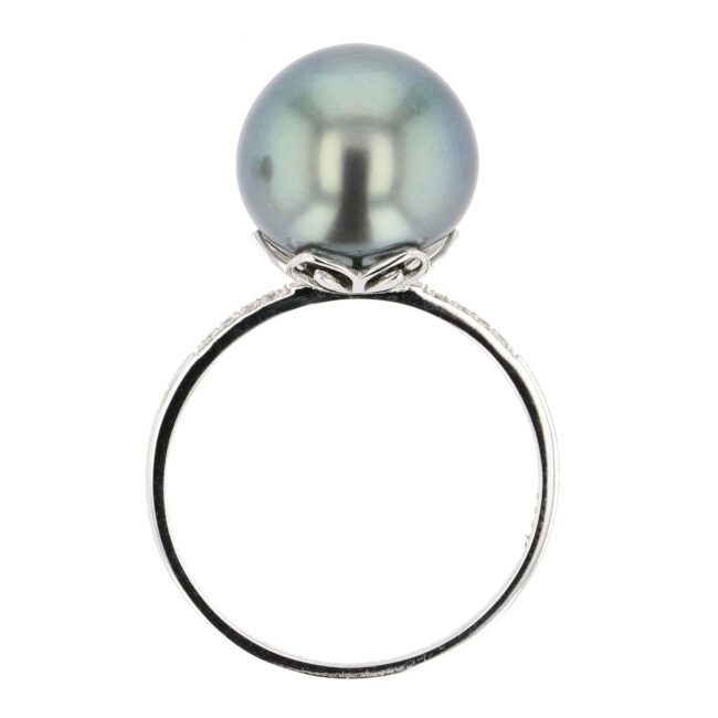 This strikingly elegant ring features a luminous 11mm Tahitian pearl set at its center, adorned on each side by brilliant diamonds, 0,15ct, and set in 14K white gold. The pearl’s soft glow contrasts beautifully with the brilliance of the diamonds, creating a harmonious balance of light and texture. This classically refined design is a versatile piece that transitions effortlessly from everyday elegance to evening glamour.