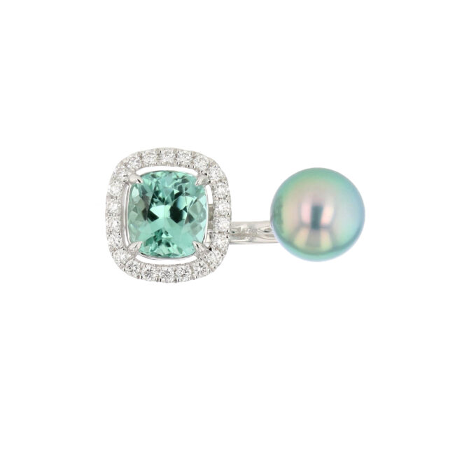This exquisitely handcrafted ring features an exceptionally verdant, gem quality, 10mm Tahitian pearl that matches perfectly to a seafoam, cushion cut tourmaline, 7.31ct, mounted on 3.23g of 18K white gold. A one-of-a-kind creation from Hinerava's Privilège Collection of dramatically vibrant and luxurious jewels.