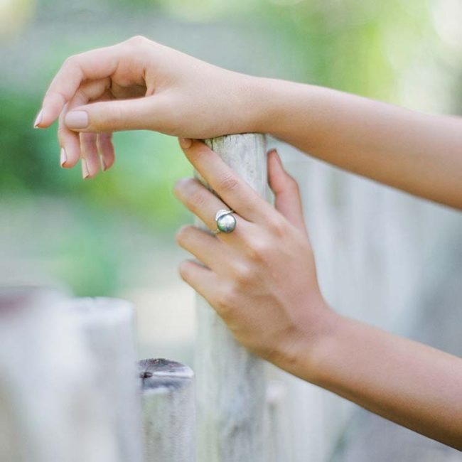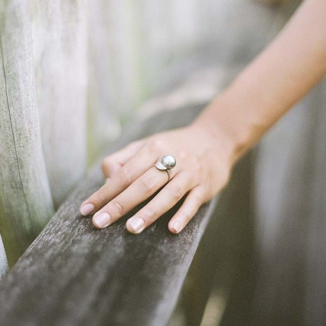 Hinerava’s Privilege Collection features an exquisite ring adorned with a diamond paved flower, 0.23 carats and a beautiful 11 mm Tahitian pearl, mounted in 18K white gold.