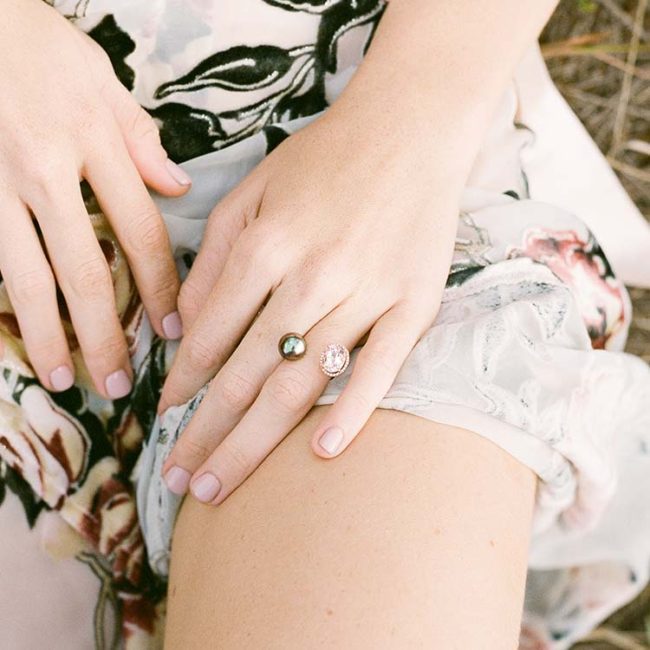 Hinerava’s Poésie Collection presents an ultra feminine open ring made of a lustrous Tahitian Pearl carefully choosen to match a rosy morganite stone, 2.59 carats, adorned with brillant diamonds, 0.08 carats, set in 14K rose gold. A quintessential Hinerava design that is romantic and ever so elegant.