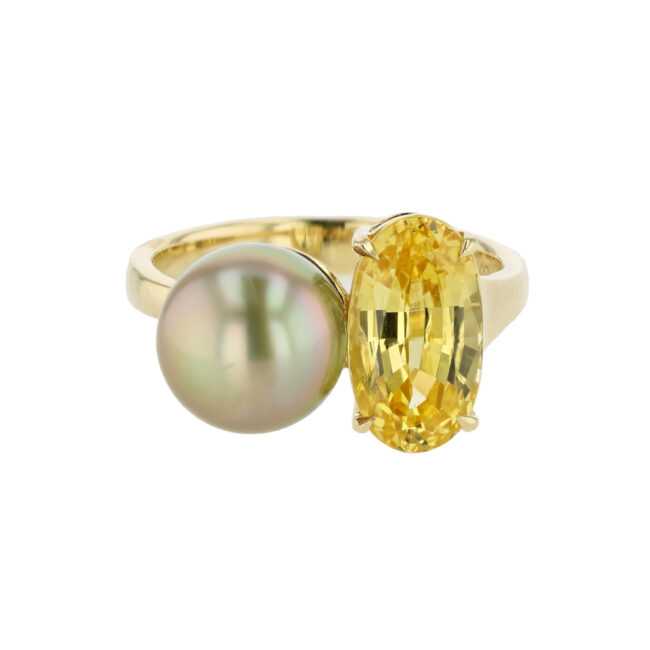 Hinerava’s Privilège Collection showcases a unique design incorporating an exceptionally rare, champagne shaded, 9mm Tahitian pearl matched to an oval cut yellow sapphire weighing 3.76 carats, set in 18K yellow gold. This ring’s brillance and elegant silhouette will elevate any look.