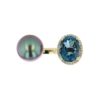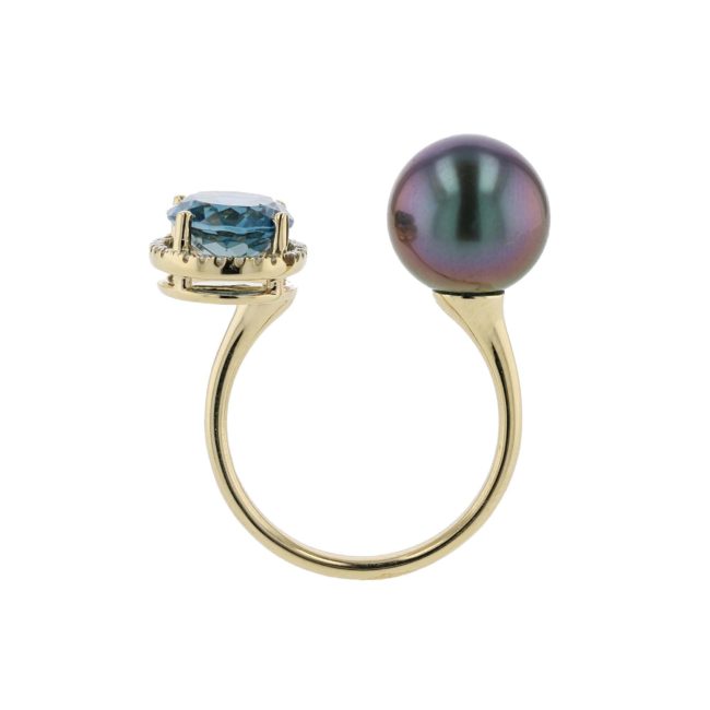 Hinerava’s Poésie Collection presents an exceptional ring made of a striking oval cut london blue topaz, 3.33 carats, haloed by brillant diamonds, 0.08 carats, and a lustruous Tahitian pearl that was carefully chosen to complement the london blue topaz. This in-between-the-finger style ring is set in 14K yellow gold. A quintessential Hinerava design that is romantic and ever so elegant.