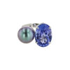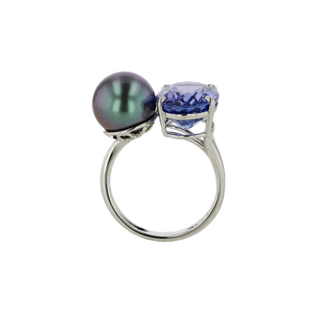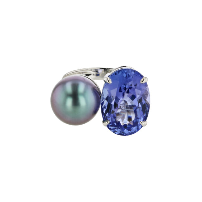 This exquisitely handcrafted ring features a hypnotic purple, gem quality, 10mm Tahitian pearl that matches perfectly to a brilliant, oval tanzanite, 6.94ct, mounted on 2.97g of 18K white gold. A one-of-a-kind creation from Hinerava’s Privilège Collection of dramatically vibrant and luxurious jewels.