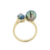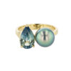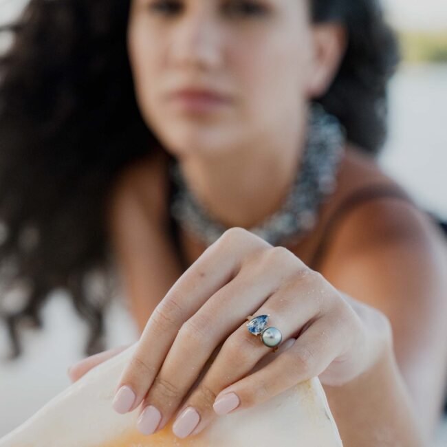 Each piece in Hinerava’s Privilège Collection embodies timeless luxury. This exquisite, one of a kind ring features an elongated cushion cut lagoon blue tourmaline weighing 4.27 carats, with a lustrous 9mm dark green Tahitian pearl, set in 3.80 grams of 18K yellow gold. A regal and dramatic design that radiates elegance.